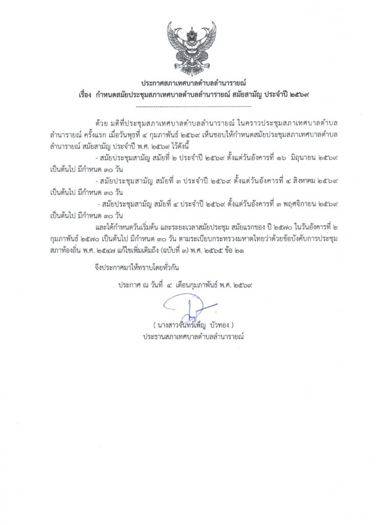 • กำหนดสมัยประชุมสภาเทศบาลตำบลลำนารายณ์ สมัยสามัญ ประจำปี 2569