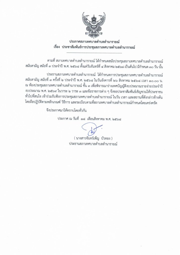 • ประชาสัมพันธ์การประชุมสภาเทศบาลตำบลลำนารายณ์ สมัยสามัญ สมัยที่ 3 ครั้งที่ 2 ประจำปี พ.ศ. 2568
