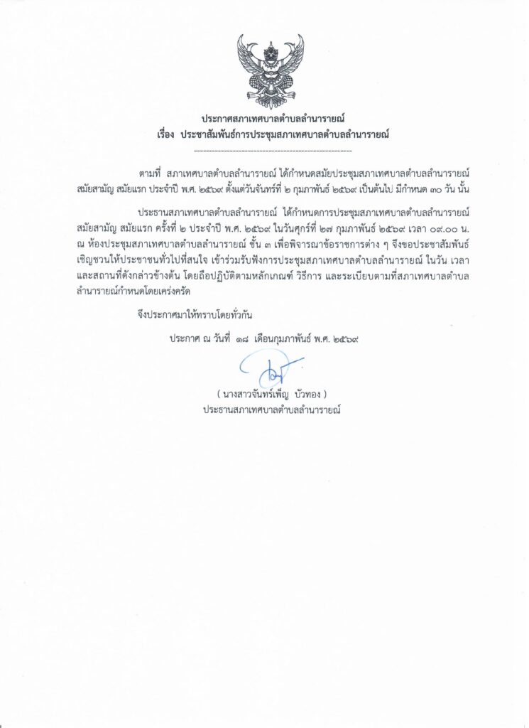 ประชาสัมพันธ์การประชุมสภาเทศบาลตำบลลำนารายณ์ สมัยสามัญ สมัยแรก ครั้งที่ 2 ประจำปี พ.ศ. 2569 ประชาสัมพันธ์การประชุมสภาเทศบาล 18 กุมภาพันธ์ 256920 กุมภาพันธ์ 2026 lamnaraicity@2021 FacebookFacebookXTwitterLINELine