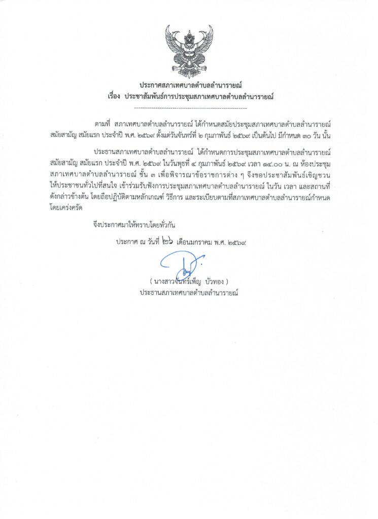 ประชาสัมพันธ์การประชุมสภาเทศบาลตำบลลำนารายณ์ สมัยสามัญ สมัยแรก ประจำปี พ.ศ. 2569