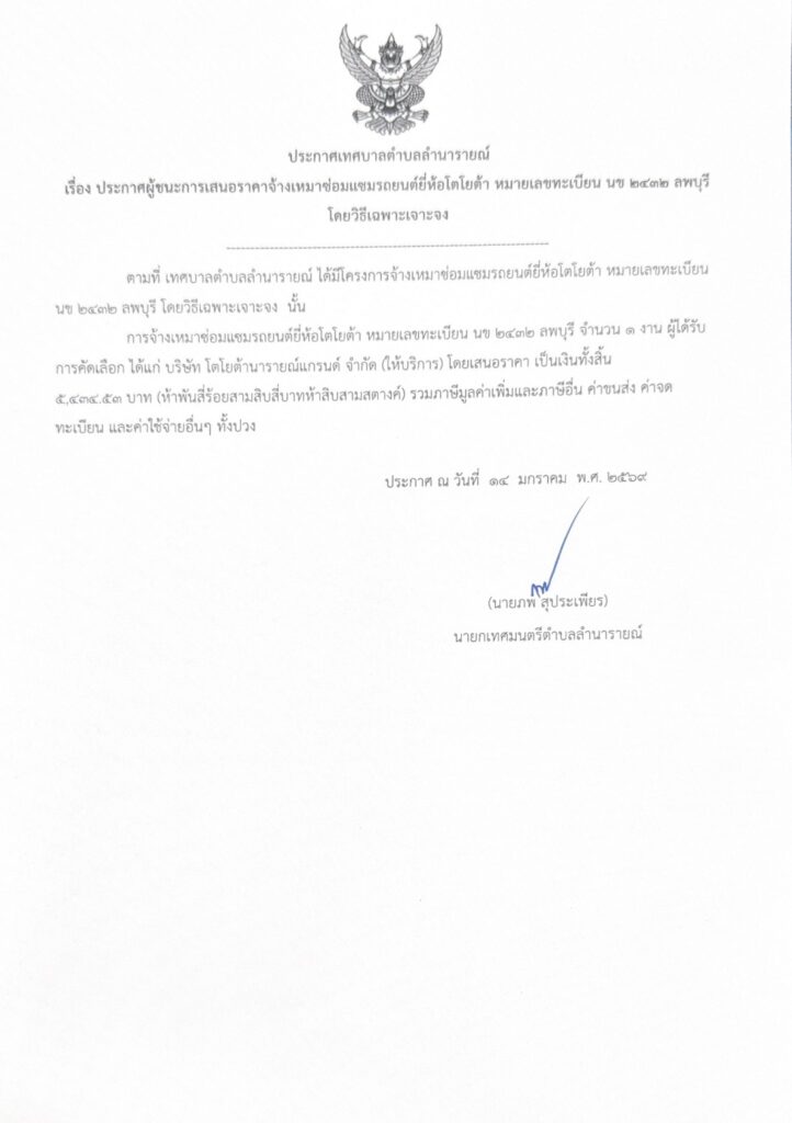 ประกาศผู้ชนะการเสนอราคาจ้างเหมาซ่อมแซมรถยนต์ยี่ห้อโตโยต้า หมายเลขทะเบียน นข 2432 ลพบุรี โดยวิธีเฉพาะเจาะจง