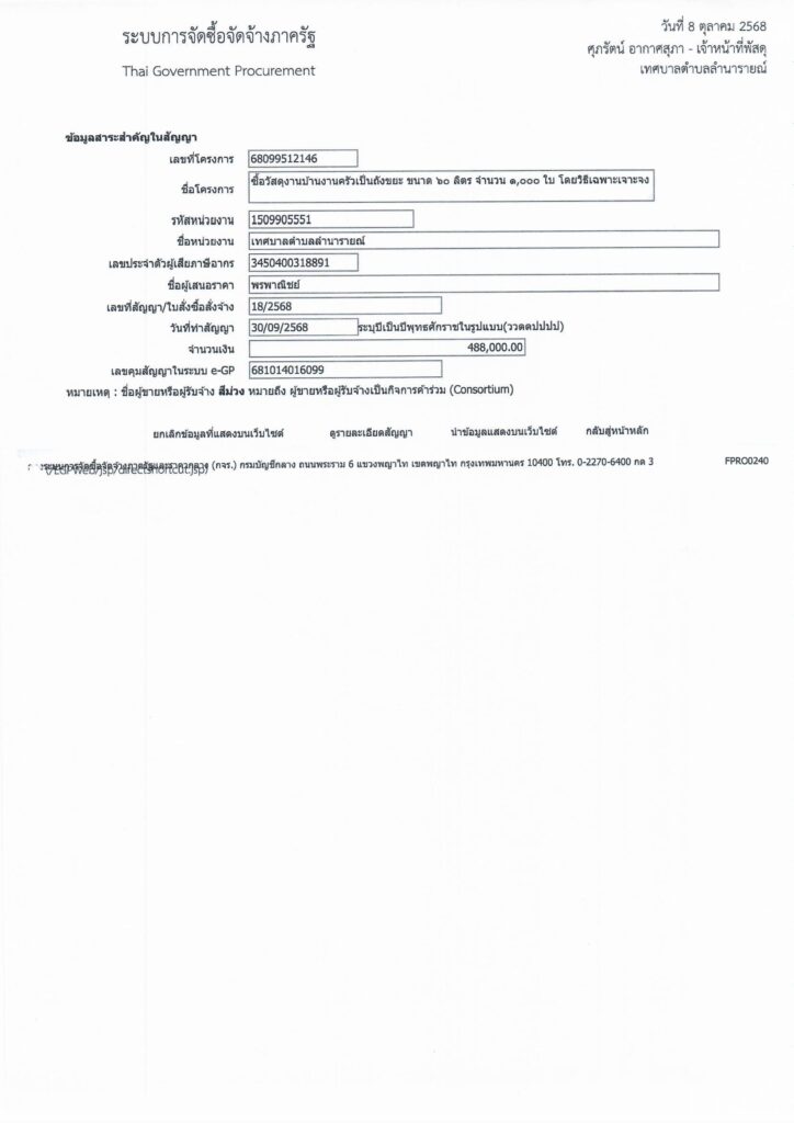 ข้อมูลสาระสำคัญของสัญญาจ้าง ข้อมูลสาระสำคัญในสัญญา 30 กันยายน 25688 ตุลาคม 2025 lamnaraicity@2021 ข้อมูลสาระสำคัญของสัญญาจ้าง เลขที่สัญญา 18/2568 ลงวันที่ 30 กันยายน 2568 โครงการซื้อวัสดุงานบ้านงานครัวเป็นถังขยะ ขนาด 60 ลิตร จำนวน 1,000 ใบ โดยวิธีเฉพาะเจาะจง FacebookFacebookXTwitterLINELine