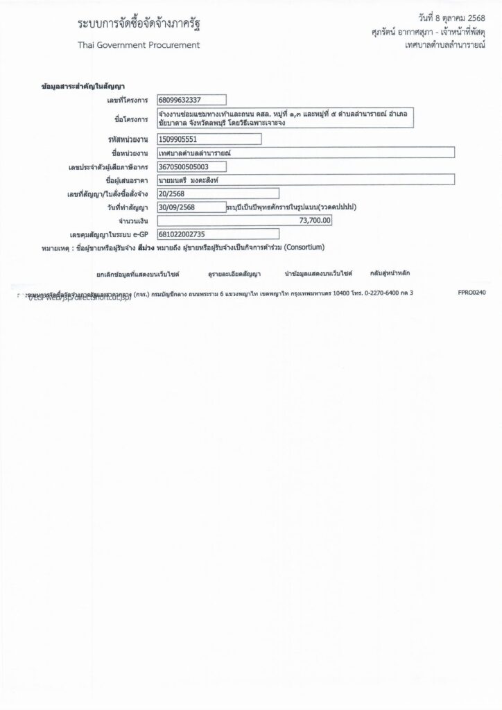 ข้อมูลสาระสำคัญของสัญญาจ้าง ข้อมูลสาระสำคัญในสัญญา 30 กันยายน 25688 ตุลาคม 2025 lamnaraicity@2021 ข้อมูลสาระสำคัญของสัญญาจ้าง เลขที่สัญญา 20/2568 โครงการจ้างงานซ่อมแซมทางเท้าและถนน คสล. หมู่ที่ 1,3 และหมู่ที่ 5 ตำบลลำนารายณ์ อำเภอชัยบาดาล จังหวัดลพบุรี โดยวิธีเฉพาะเจาะจง FacebookFacebookXTwitterLINELine
