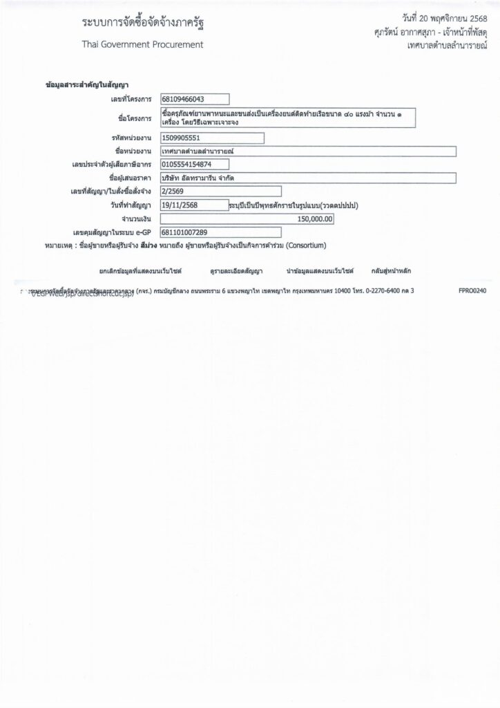 ข้อมูลสาระสำคัญของสัญญาจ้าง เลขที่สัญญา 2/2569 ซื้อครุภัณฑ์ยานพาหนะและขนส่งเป็นเครื่องยนต์ติดท้ายเรือขนาด 40 แรงม้าจำนวน 1 เครื่อง โดยวิธีเฉพาะเจาะจง