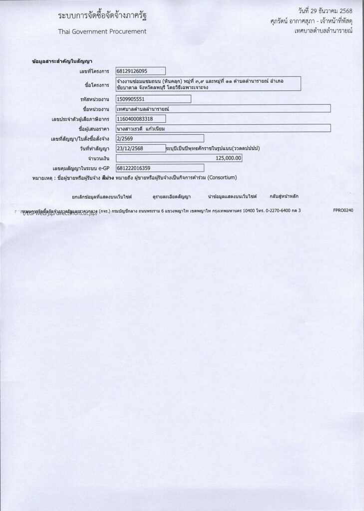 ข้อมูลสาระสำคัญของสัญญาจ้าง เลขที่สัญญา 2/2569 จ้างงานซ่อมแซมถนน (หินคลุก) หมู่ที่ 3,9 และหมู่ที่ 11 ตำบลลำนารายณ์ อำเภอชัยบาดาล จังหวัดลพบุรี โดยวิธีเฉพาะเจาะจง