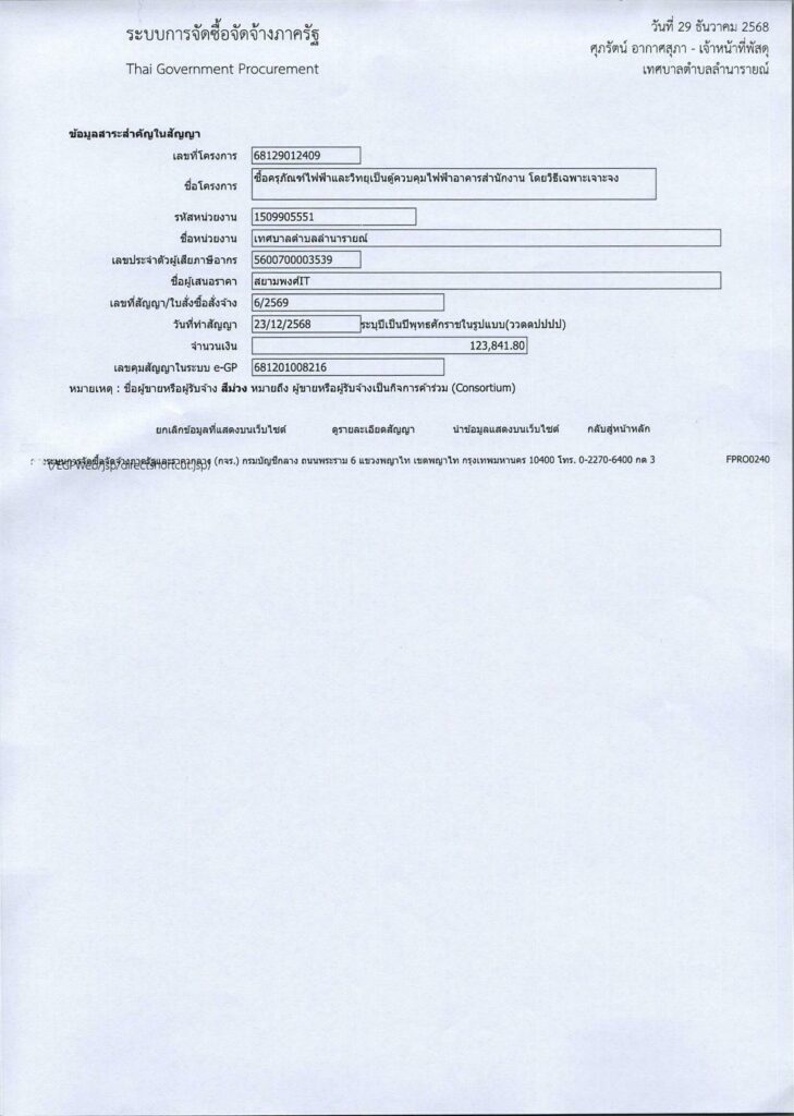 ข้อมูลสาระสำคัญของสัญญาจ้าง เลขที่สัญญา 6/2569 ซื้อครุภัณฑ์ไฟฟ้าและวิทยุเป็นตู้ควบคุมไฟฟ้าอาคารสำนักงาน โดยวิธีเฉพาะเจาะจง