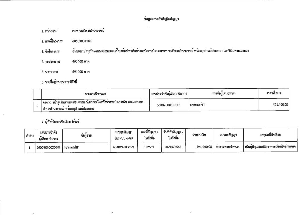ข้อมูลสาระสำคัญของสัญญาจ้าง เลขที่สัญญา 1/2569 จ้างเหมาบำรุงรักษาและซ่อมแซมแก้ไขกล้องโทรทัศน์วงจรปิดภายในเขตเทศบาลตำบลลำนารายณ์ พร้อมอุปกรณ์ประกอบ โดยวิธีเฉพาะเจาะจง