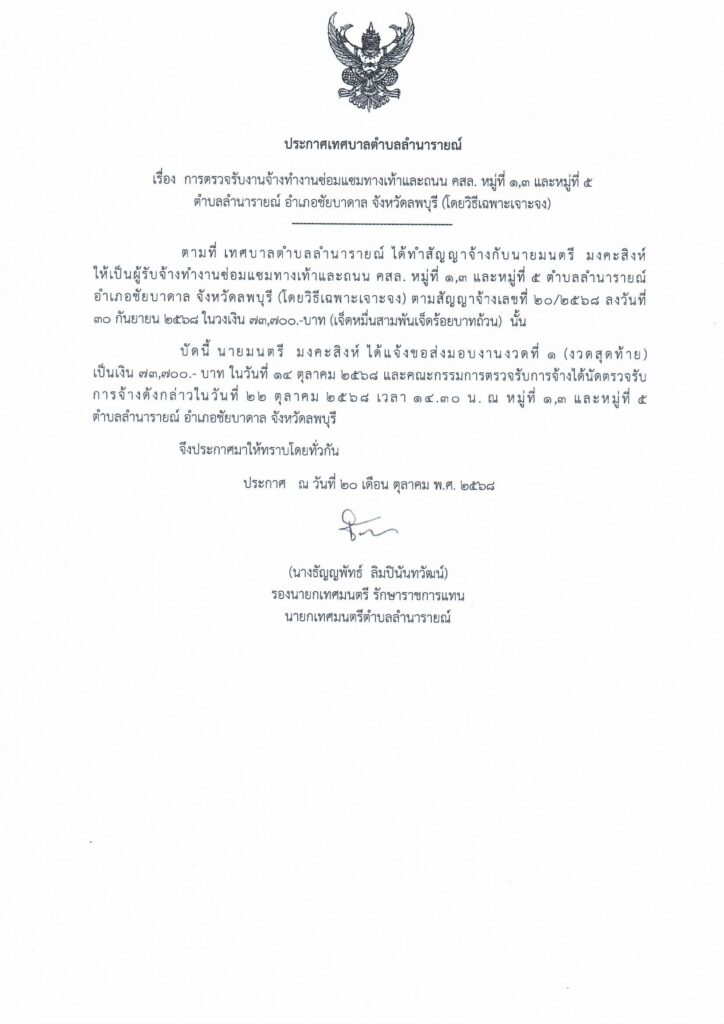 ประกาศเทศบาลตำบลลำนารายณ์ เรื่อง การตรวจรับงานจ้างทำงานซ่อมแซมทางเท้าและถนน คสล. หมู่ที่ 1,3 และหมู่ที่ 5 ตำบลลำนารายณ์ อำเภอชัยบาดาล จังหวัดลพบุรี (โดยวิธีเฉพาะเจาะจง) ประกาศการตรวจรับงานจ้าง 20 ตุลาคม 256824 ตุลาคม 2025 lamnaraicity@2021 FacebookFacebookXTwitterLINELine