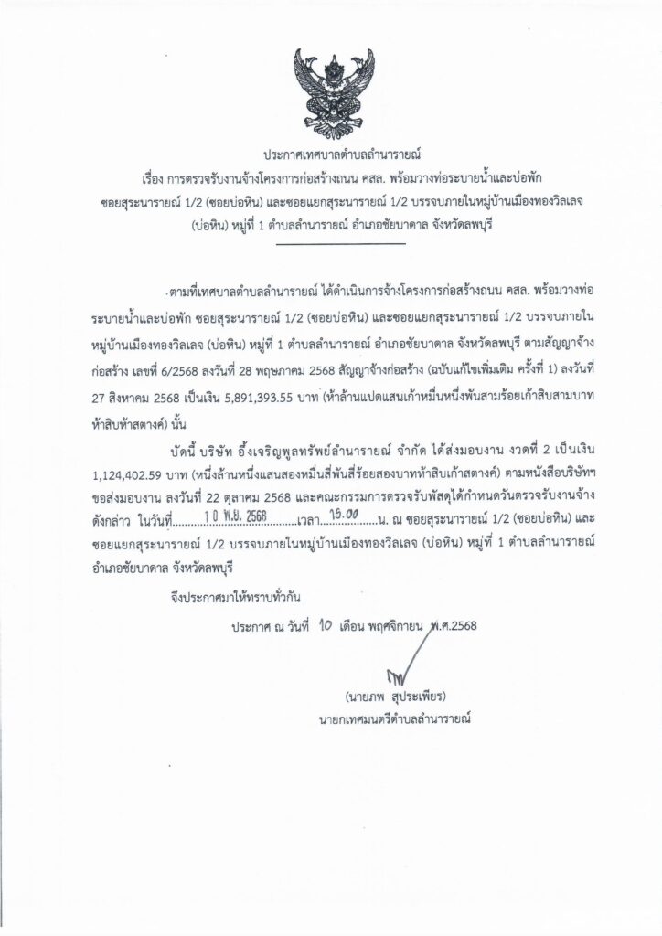 ประกาศเทศบาลตำบลลำนารายณ์ เรื่อง การตรวจรับงานจ้างโครงการก่อสร้างถนน คสล. พร้อมวางท่อระบายและบ่อพัก ซอยสุระนารายณ์ 1/2 (ซอยบ่อหิน) และซอยแยกสุระนารายณ์ 1/2 บรรจบภายในหมู่บ้านเมืองทองวิลเลจ (บ่อหิน) หมู่ที่ 1 ตำบลลำนารายณ์ อำเภอชัยบาดาล จังหวัดลพบุรี (งวดที่ 2)
