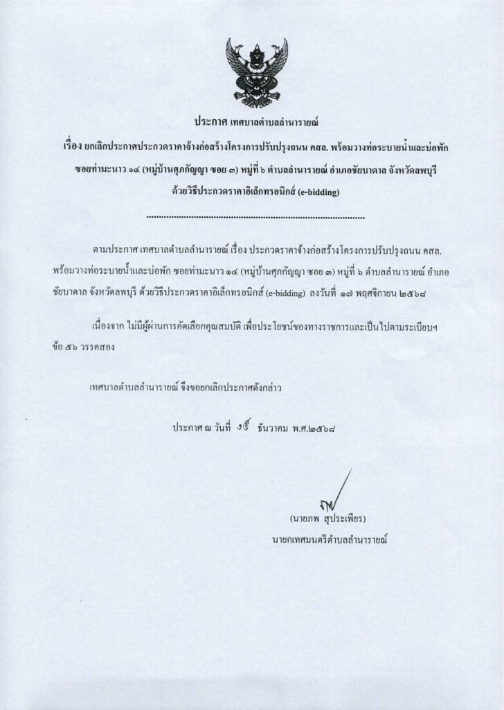 ประกาศเทศบาลตำบลลำนารายณ์ เรื่อง ยกเลิกประกาศประกวดราคาจ้างก่อสร้างโครงการปรับปรุงถนน คสล. พร้อมวางท่อระบายน้ำและบ่อพัก ซอยท่ามะนาว 14 (หมู่บ้านศุภกัญญา ซอย 3) หมู่ที่ 6 ตำบลลำนารายณ์ อำเภอชัยบาดาล จังหวัดลพบุรี ด้วยวิธีประกวดราคาอิเล็กทรอนิกส์ (e-bidding)