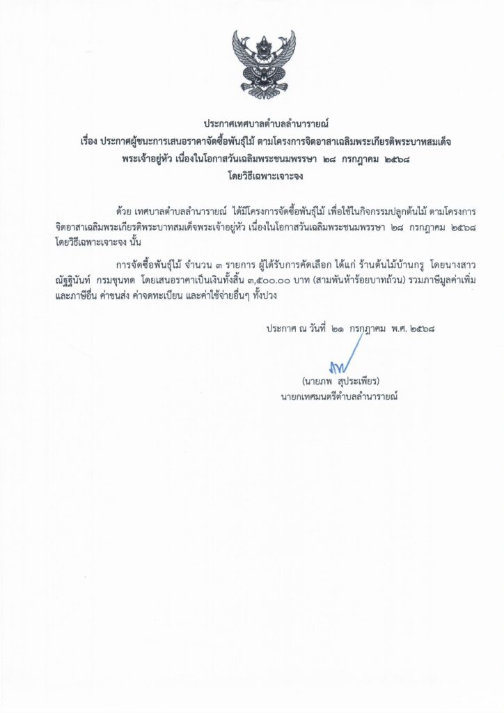 ประกาศผู้ชนะการเสนอราคาจัดซื้อพันธุ์ไม้ ตามโครงการจิตอาสาเฉลิมพระเกียรติพระบาทสมเด็จพระเจ้าอยู่หัว เนื่องในโอกาสวันเฉลิมพระชนมพรรษา 28 กรกฎาคม 2568 โดยวิธีเฉพาะเจาะจง ประกาศผู้ชนะการเสนอราคา 21 กรกฎาคม 25681 ตุลาคม 2025 lamnaraicity@2021 FacebookFacebookXTwitterLINELine