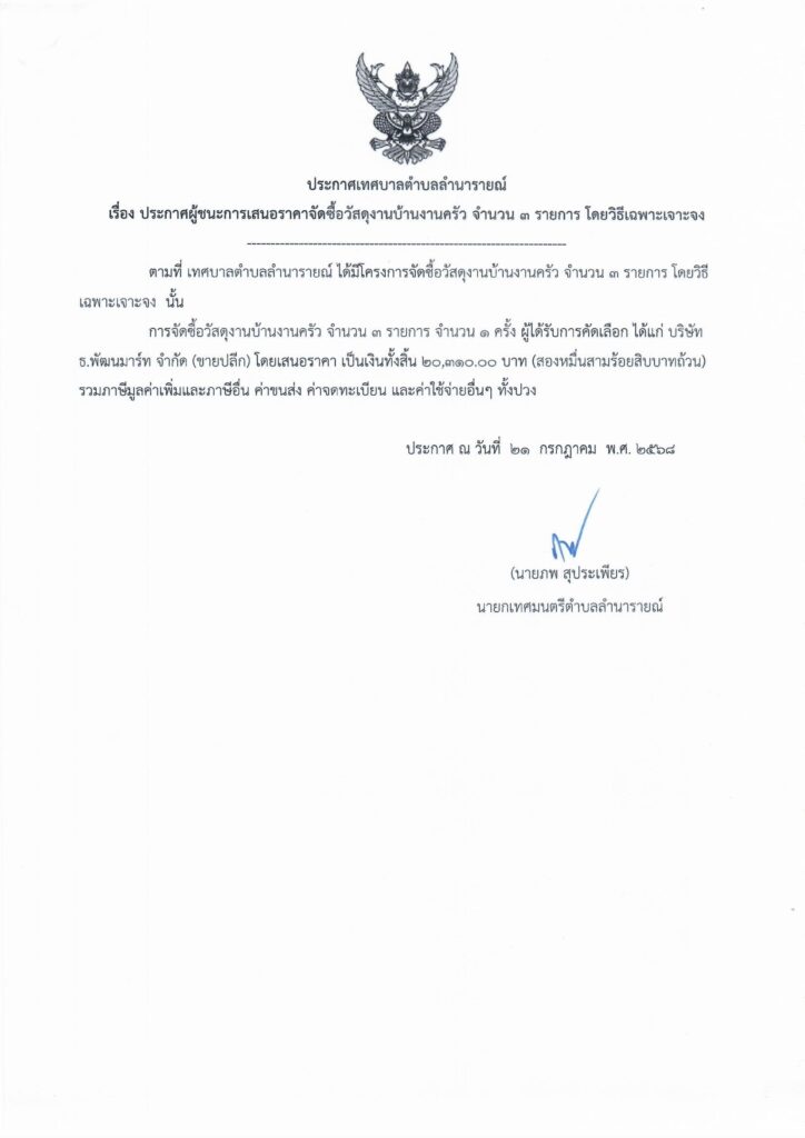 ประกาศผู้ชนะการเสนอราคาจัดซื้อวัสดุงานบ้านงานครัว จำนวน 3 รายการ โดยวิธีเฉพาะเจาะจง ประกาศผู้ชนะการเสนอราคา 21 กรกฎาคม 25681 ตุลาคม 2025 lamnaraicity@2021 FacebookFacebookXTwitterLINELine