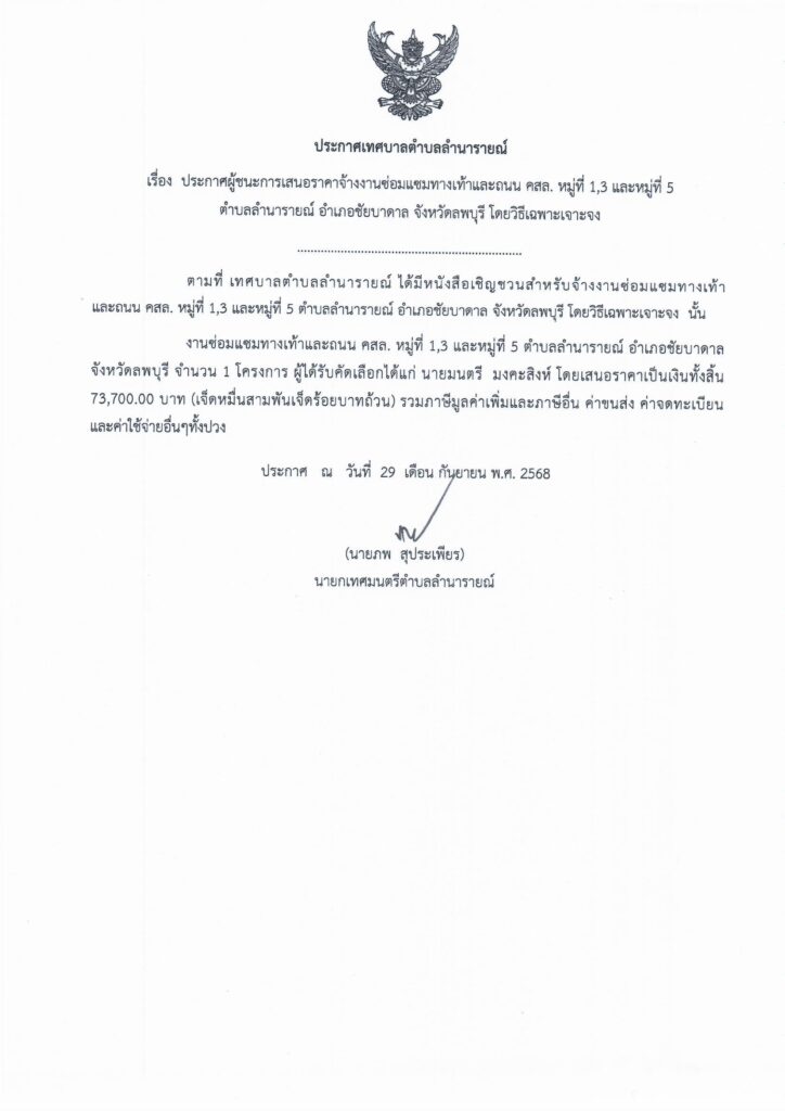 ประกาศผู้ชนะการเสนอราคาจ้างงานซ่อมแซมทางเท้าและถนน คสล. หมู่ที่ 1,3 และหมู่ที่ 5 ตำบลลำนารายณ์ อำเภอชัยบาดาล จังหวัดลพบุรี โดยวิธีเฉพาะเจาะจง ประกาศผู้ชนะการเสนอราคา 29 กันยายน 25686 ตุลาคม 2025 lamnaraicity@2021 FacebookFacebookXTwitterLINELine