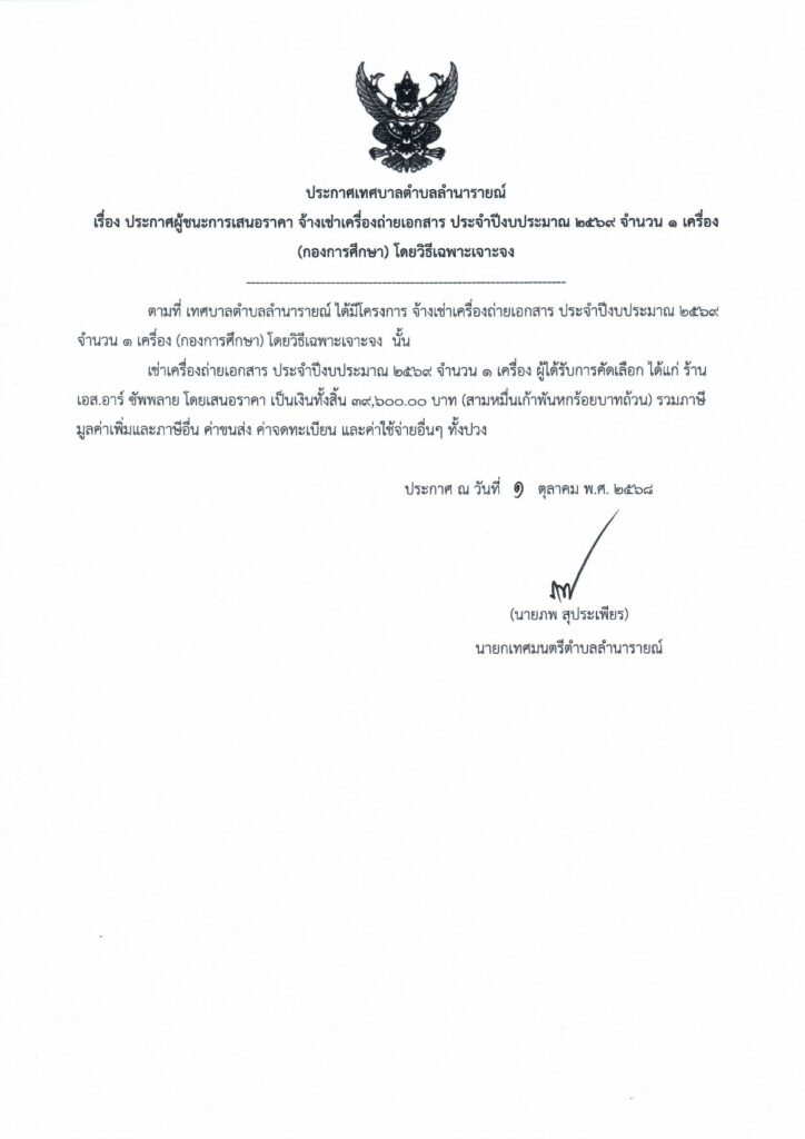 ประกาศผู้ชนะการเสนอราคา จ้างเช่าเครื่องถ่ายเอกสาร ประจำปีงบประมาณ 2568 จำนวน 1 เครื่อง (กองการศึกษา) โดยวิธีเฉพาะเจาะจง ประกาศผู้ชนะการเสนอราคา 1 ตุลาคม 256815 ตุลาคม 2025 lamnaraicity@2021 FacebookFacebookXTwitterLINELine