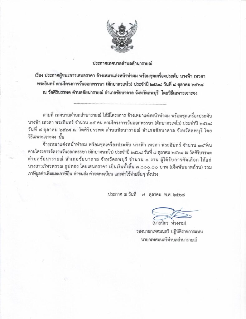 ประกาศผู้ชนะการเสนอราคา จ้างเหมาแต่งหน้าทำผม พร้อมชุดเครื่องประดับ นางฟ้า เทวดา พระอินทร์ ตามโครงการวันออกพรรษา (ตักบาตรเทโว) ประจำปี 2568 วันที่ 8 ตุลาคม 2568 ณวัดศิริบรรบต ตำบลชัยนารายณ์ อำเภอชัยบาดาล จังหวัดลพบุรี โดยวิธีเฉพาะเจาะจง ประกาศผู้ชนะการเสนอราคา 7 ตุลาคม 256817 ตุลาคม 2025 lamnaraicity@2021 FacebookFacebookXTwitterLINELine
