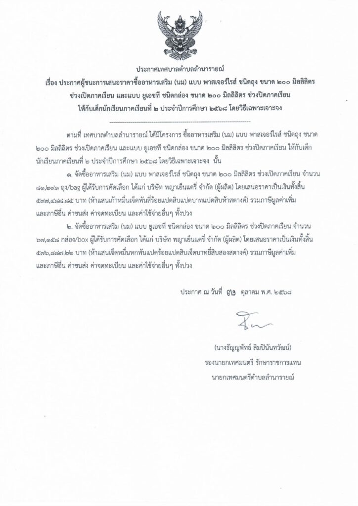 ประกาศผู้ชนะการเสนอราคาซื้ออาหารเสริม (นม) แบบ พาสเจอร์ไรส์ ชนิดถุง ขนาด 200 มิลลิลิตร ช่วงเปิดภาคเรียน และแบบ ยูเอชที ชนิดกล่อง ขนาด 200 มิลลิลิตร ช่วงปิดภาคเรียน ให้กับเด็กนักเรียนภาคเรียนที่ 2 ประจำปีการศึกษา 2568 โดยวิธีเฉพาะเจาะจง ประกาศผู้ชนะการเสนอราคา 31 ตุลาคม 256831 ตุลาคม 2025 lamnaraicity@2021 FacebookFacebookXTwitterLINELine