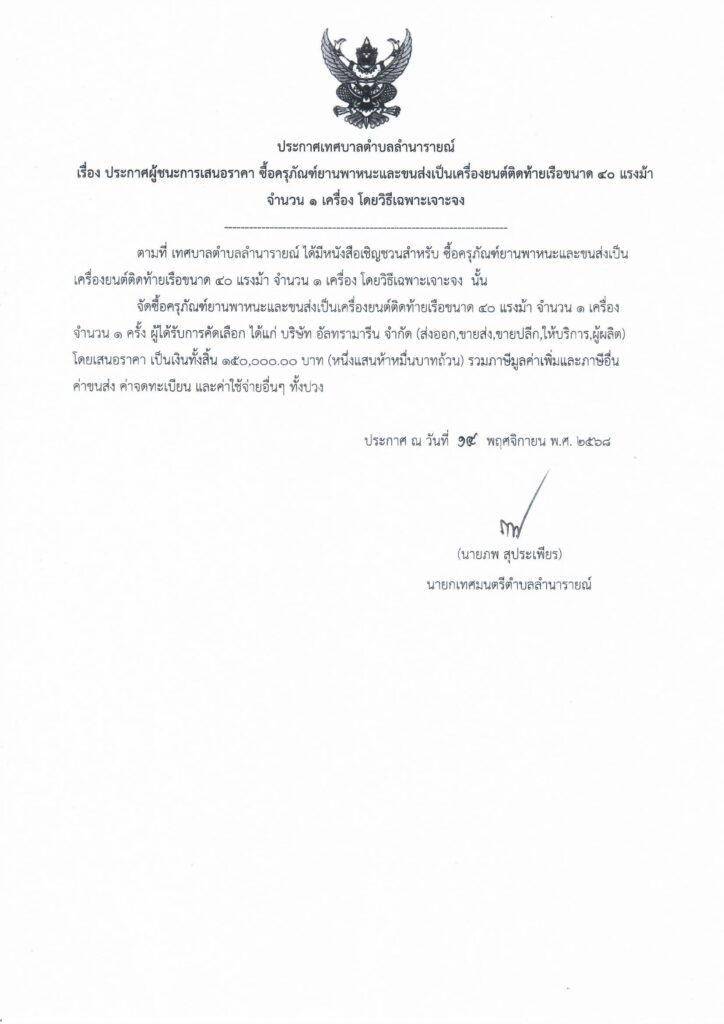 ประกาศผู้ชนะการเสนอราคา ซื้อครุภัณฑ์ยานพาหนะและขนส่งเป็นเครื่องยนต์ติดท้ายเรือขนาด 40 แรงม้า จำนวน 1 เครื่อง โดยวิธีเฉพาะเจาะจง ประกาศผู้ชนะการเสนอราคา 14 พฤศจิกายน 256814 พฤศจิกายน 2025 lamnaraicity@2021 FacebookFacebookXTwitterLINELine
