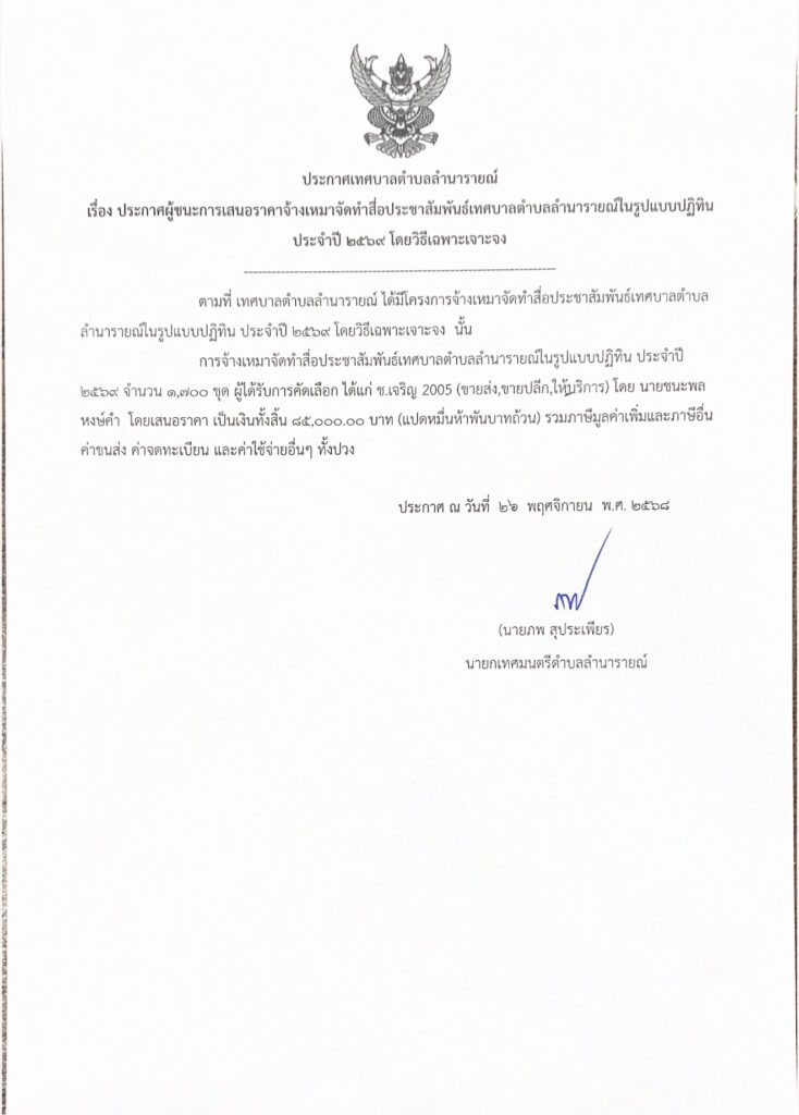 ประกาศผู้ชนะการเสนอราคาจ้างเหมาจัดทำสื่อประชาสัมพันธ์เทศบาลตำบลลำนารายณ์ในรูปแบบปฏิทิน ประจำปี 2569 โดยวิธีเฉพาะเจาะจง