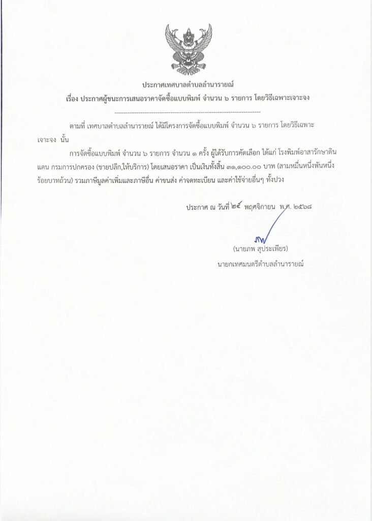 ประกาศผู้ชนะการเสนอราคาจัดซื้อแบบพิมพ์ จำนวน 6 รายการ โดยวิธีเฉพาะเจาะจง