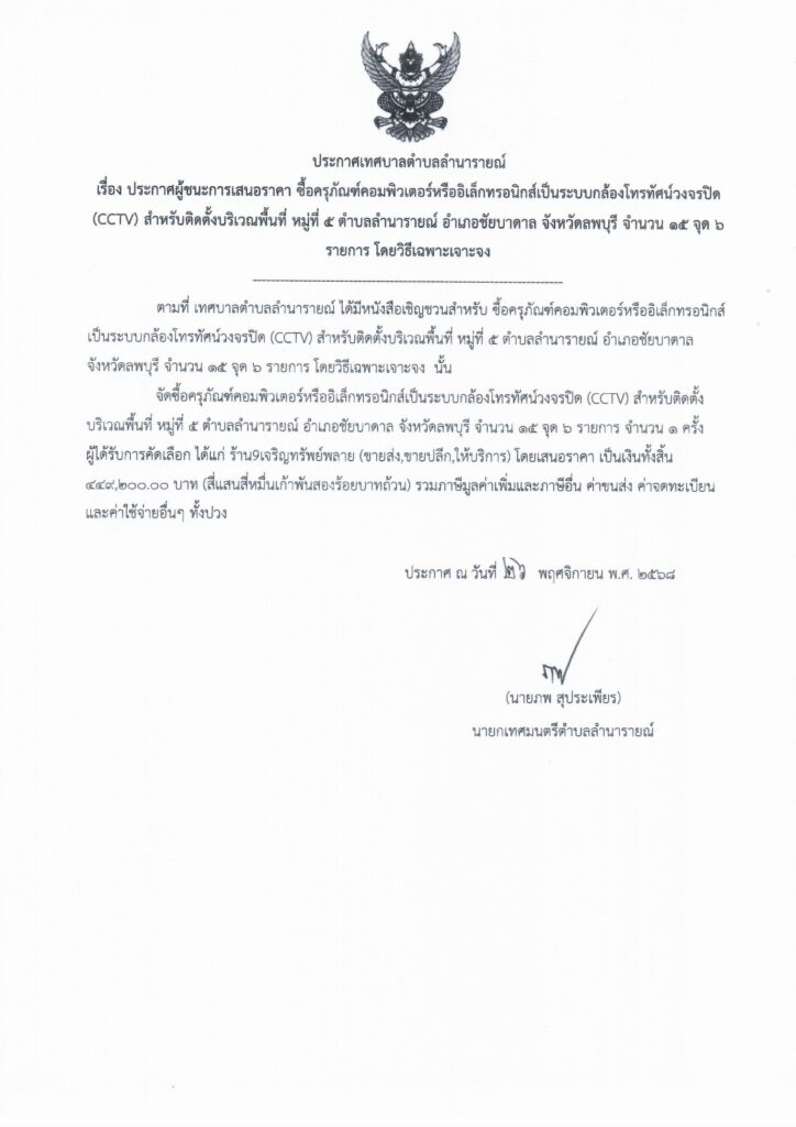 ประกาศผู้ชนะการเสนอราคา ซื้อครุภัณฑ์คอมพิวเตอร์หรืออิเล็กทรอนิกส์เป็นระบบกล้องโทรศัพท์วงจรปิด (CCTV) สำหรับติดตั้งบริเวณพื้นที่ หมู่ที่ 5 ตำบลลำนารายณ์ อำเภอชัยบาดาล จังหวัดลพบุรี จำนวน 15 จุด 6 รายการ โดยวิธีเฉพาะเจาะจง