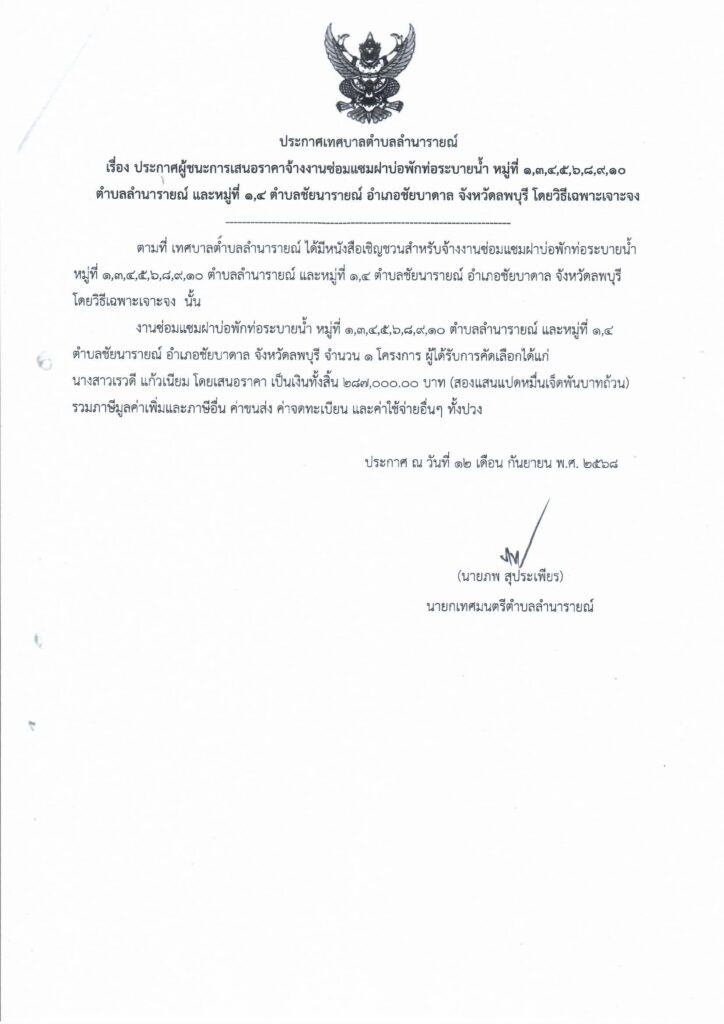 ประกาศผู้ชนะการเสนอราคาจ้างงานซ่อมแซมฝาบ่อพักท่อระบายน้ำ หมู่ที่ 1,3,4,5,6,8,9,10 ตำบลลำนารายณ์ และหมู่ที่ 1,4 ตำบลชัยนารายณ์ อำเภอชัยบาดาล จังหวัดลพบุรี โดยวิธีเฉพาะเจาะจง