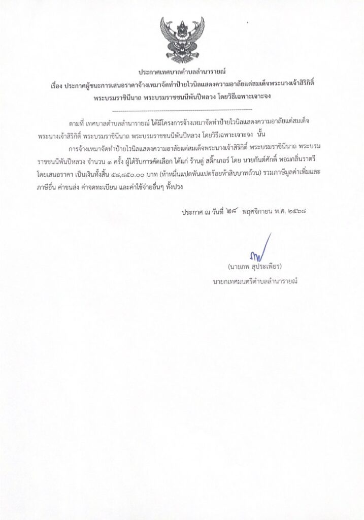 ประกาศผู้ชนะการเสนอราคาจ้างเหมาจัดทำป้ายไวนิลแสดงความอาลัยแด่สมเด็จพระนางเจ้าสิริกิติ์ พระบรมราชินีนาถ พระบรมราชชนนีพันปีหลวง โดยวิธีเฉพาะเจาะจง ประกาศผู้ชนะการเสนอราคา 28 พฤศจิกายน 25681 ธันวาคม 2025 lamnaraicity@2021 FacebookFacebookXTwitterLINELine