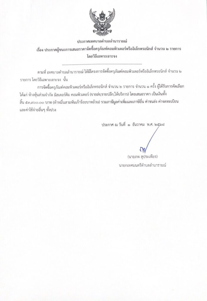 ประกาศผู้ชนะการเสนอราคาจัดซื้อครุภัณฑ์คอมพิวเตอร์หรืออิเล็กทรอนิกส์ จำนวน 2 รายการ โดยวิธีเฉพาะเจาะจง ประกาศผู้ชนะการเสนอราคา 1 ธันวาคม 25688 ธันวาคม 2025 lamnaraicity@2021 FacebookFacebookXTwitterLINELine