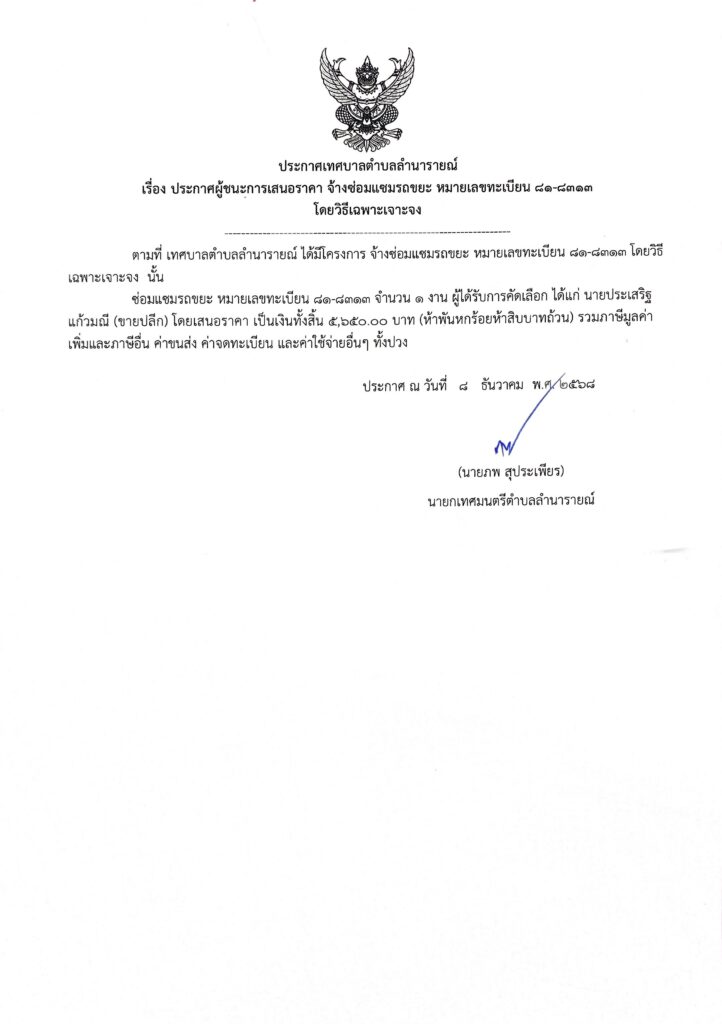 ประกาศผู้ชะการเสนอราคา จ้างซ่อมแซมรถขยะ หมายเลขทะเบียน 81-8313 โดยวิธีเฉพาะเจาะจง ประกาศผู้ชนะการเสนอราคา 8 ธันวาคม 256812 ธันวาคม 2025 lamnaraicity@2021 FacebookFacebookXTwitterLINELine