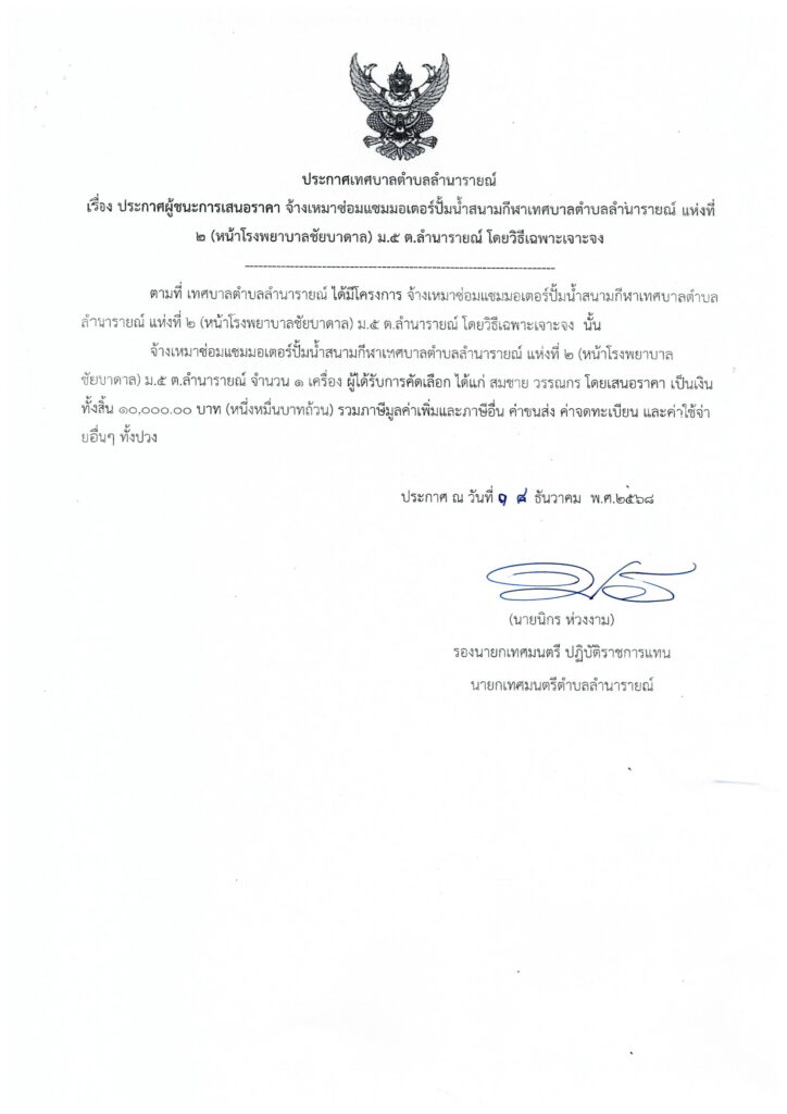 ประกาศผู้ชนะการเสนอราคา จ้างเหมาซ่อมแซมมอเตอร์ปั้มน้ำสนามกีฬาเทศบาลตำบลลำนารายณ์ แห่งที่ 2 (หน้าโรงพยาบาลชัยบาดาล) ม.5 ต.ลำนารายณ์ โดยวิธีเฉพาะเจาะจง ประกาศผู้ชนะการเสนอราคา 18 ธันวาคม 256823 ธันวาคม 2025 lamnaraicity@2021 FacebookFacebookXTwitterLINELine
