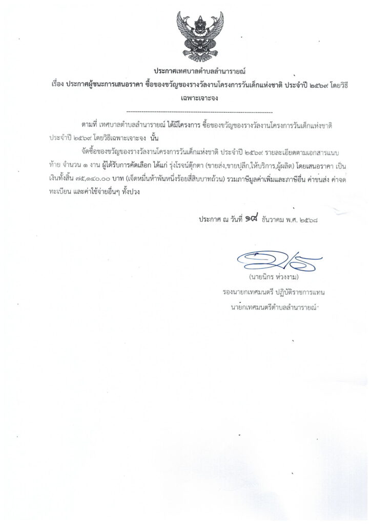 • ประกาศผู้ชนะการเสนอราคา ซื้อของขวัญของรางวัลงานโครงการวันเด็กแห่งชาติ ประจำปี 2569 โดยวิธีเฉพาะเจาะจง