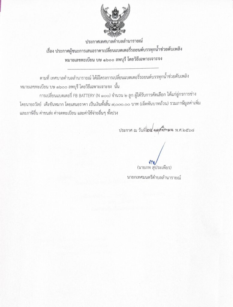 ประกาศผู้ชนะการเสนอราคาเปลี่ยนแบตเตอรี่รถยนต์บรรทุกน้ำช่วยดับเพลิง หมายเลขทะเบียน บษ 1600 ลพบุรี โดยวิธีเฉพาะเจาะจง ประกาศผู้ชนะการเสนอราคา 24 ธันวาคม 256824 ธันวาคม 2025 lamnaraicity@2021 FacebookFacebookXTwitterLINELine