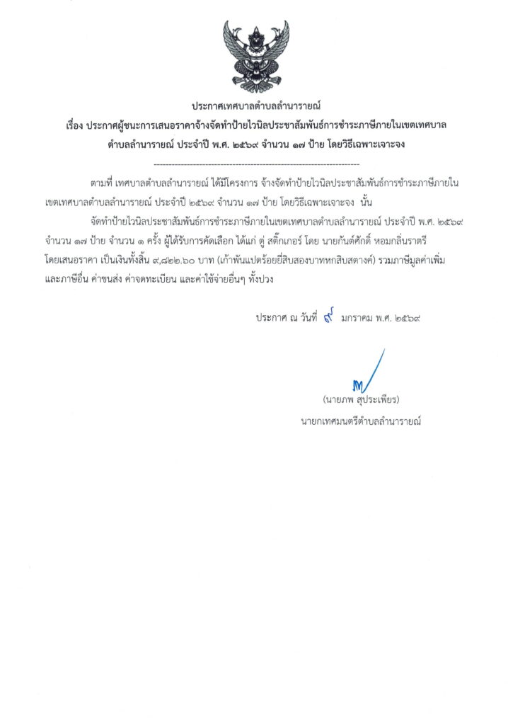 ประกาศผู้ชนะการเสนอราคาจ้างจัดทำป้ายไวนิลประชาสัมพันธ์การชำระภาษีภายในเขตเทศบาลตำบลลำนารายณ์ ประจำปี พ.ศ. 2569 จำนวน 17 ป้าย โดยวิธีเฉพาะเจาะจง ประกาศผู้ชนะการเสนอราคา 9 มกราคม 25699 มกราคม 2026 lamnaraicity@2021 FacebookFacebookXTwitterLINELine