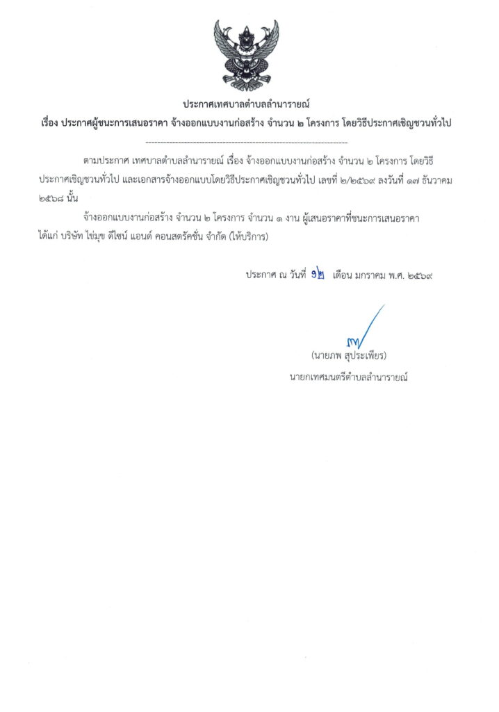 ประกาศผู้ชนะการเสนอราคา จ้างออกแบบงานก่อสร้าง จำนวน 2 โครงการ โดยวิธีประกาศเชิญชวนทั่วไป ประกาศผู้ชนะการเสนอราคา 12 มกราคม 256913 มกราคม 2026 lamnaraicity@2021 FacebookFacebookXTwitterLINELine