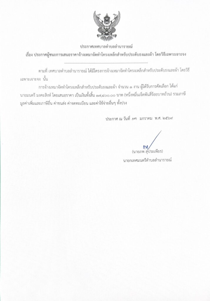 ประกาศผู้ชนะการเสนอราคาจ้างเหมาจัดทำโครงเหล็กสำหรับประดับธงและผ้า โดยวิธีเฉพาะเจาะจง ประกาศผู้ชนะการเสนอราคา 13 มกราคม 256913 มกราคม 2026 lamnaraicity@2021 FacebookFacebookXTwitterLINELine