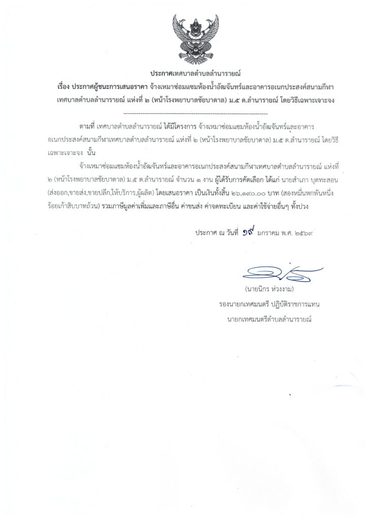 ประกาศผู้ชนะการเสนอราคา จ้างเหมาซ่อมแซมห้องน้ำอัฒจันทร์และอาคารอเนกประสงค์สนามกีฬาเทศบาลตำบลลำนารายณ์ แห่งที่ 2 (หน้าโรงพยาบาลชัยบาดาล) ม.5 ต.ลำนารายณ์โดยวิธีเฉพาะเจาะจง ประกาศผู้ชนะการเสนอราคา 19 ธันวาคม 256820 มกราคม 2026 lamnaraicity@2021 FacebookFacebookXTwitterLINELine