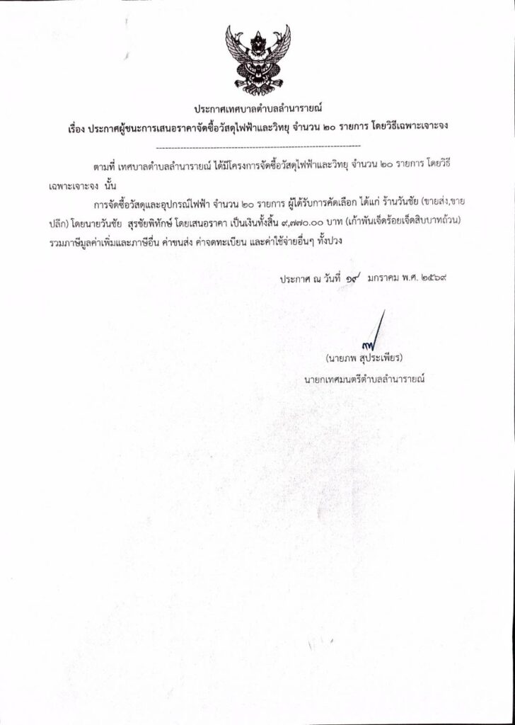 ประกาศผู้ชนะการเสนอราคาจัดซื้อวัสดุไฟฟ้าและวิทยุ จำนวน 20 รายการ โดยวิธีเฉพาะเจาะจง ประกาศผู้ชนะการเสนอราคา 19 มกราคม 256920 มกราคม 2026 lamnaraicity@2021 FacebookFacebookXTwitterLINELine