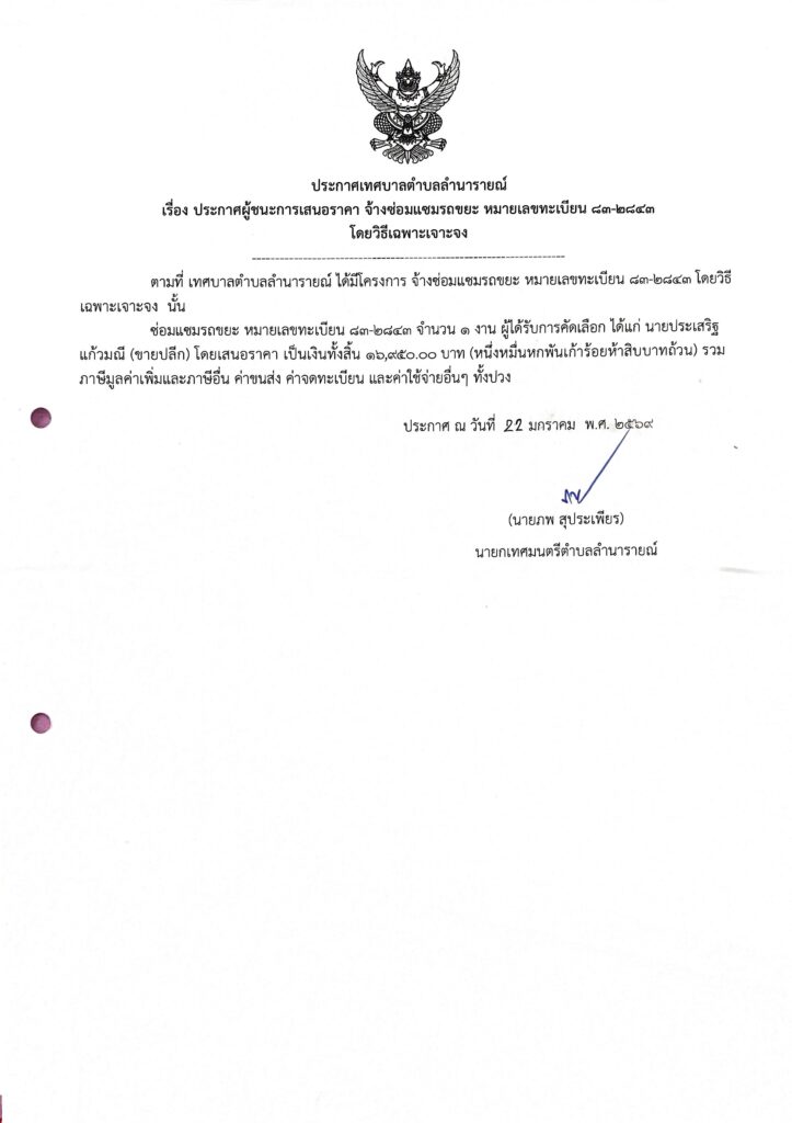 ประกาศผู้ชนะการเสนอราคา จ้างซ่อมแซมรถขยะ หมายเลขทะเบียน 83-2843 โดยวิธีเฉพาะเจาะจง ประกาศผู้ชนะการเสนอราคา 22 มกราคม 256922 มกราคม 2026 lamnaraicity@2021 FacebookFacebookXTwitterLINELine