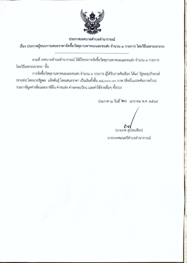 • ประกาศผู้ชนะการเสนอราคาจัดซื้อวัสดุยานพาหนะและขนส่ง จำนวน 3 รายการ โดยวิธีเฉพาะเจาะจง