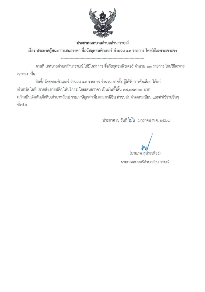 • ประกาศผู้ชนะการเสนอราคา