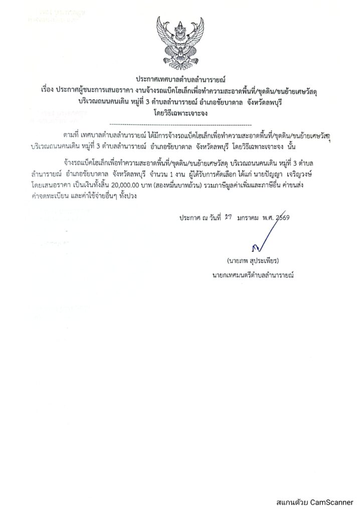 ประกาศผู้ชนะการเสนอราคา งานจ้างรถแบ๊คโฮเล็กเพื่อทำความสะอาดพื้นที่/ขุดดิน/ขนย้ายเศษวัสดุ บริเวณถนนคนเดิน หมู่ที่ 3 ตำบลลำนารายณ์ อำเภอชัยบาดาล จังหวัดลพบุรี