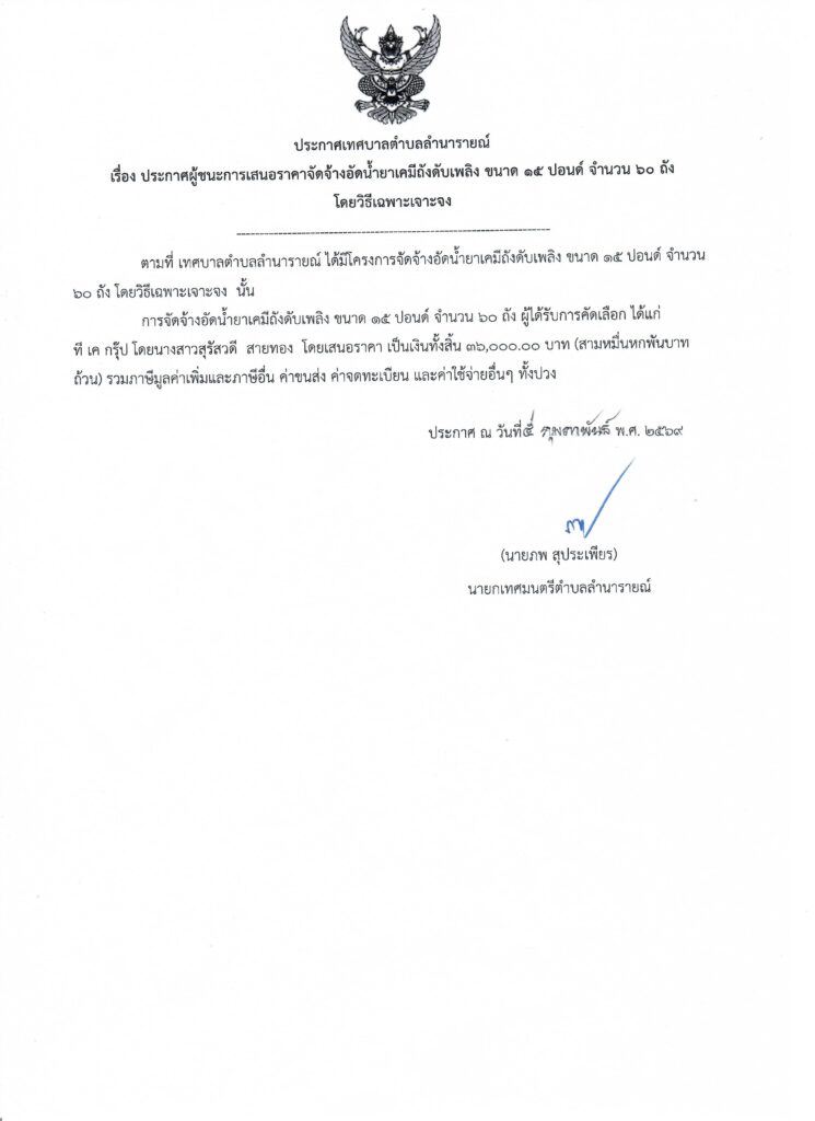 ประกาศผู้ชนะการเสนอราคาจัดจ้างอัดน้ำยาเคมีถังดับเพลิง ขนาด 15 ปอนด์ จำนวน 60 ถัง โดยวิธีเฉพาะเจาะจง ประกาศผู้ชนะการเสนอราคา 5 กุมภาพันธ์ 25695 กุมภาพันธ์ 2026 lamnaraicity@2021 FacebookFacebookXTwitterLINELine