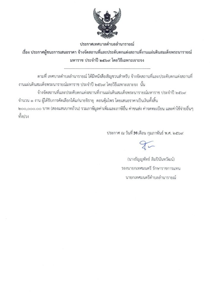 ประกาศผู้ชนะการเสนอราคา จ้างจัดสถานที่และประดับตกแต่งสถานที่งานแผ่นดินสมเด็จพระนารายณ์มหาราช ประจำปี 2569 โดยวิธีเฉพาะเจาะจง ประกาศผู้ชนะการเสนอราคา 10 กุมภาพันธ์ 256910 กุมภาพันธ์ 2026 lamnaraicity@2021 FacebookFacebookXTwitterLINELine
