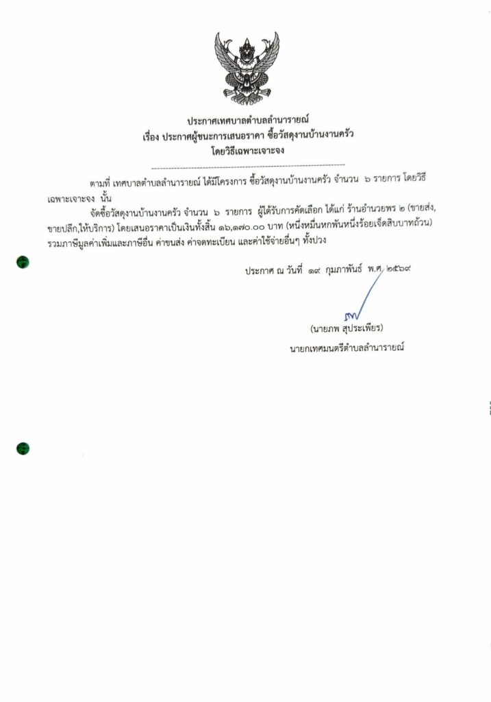 ประกาศผู้ชนะการเสนอราคา ซื้อวัสดุงานบ้านงานครัว โดยวิธีเฉพาะเจาะตง ประกาศผู้ชนะการเสนอราคา 19 กุมภาพันธ์ 256920 กุมภาพันธ์ 2026 lamnaraicity@2021 FacebookFacebookXTwitterLINELine