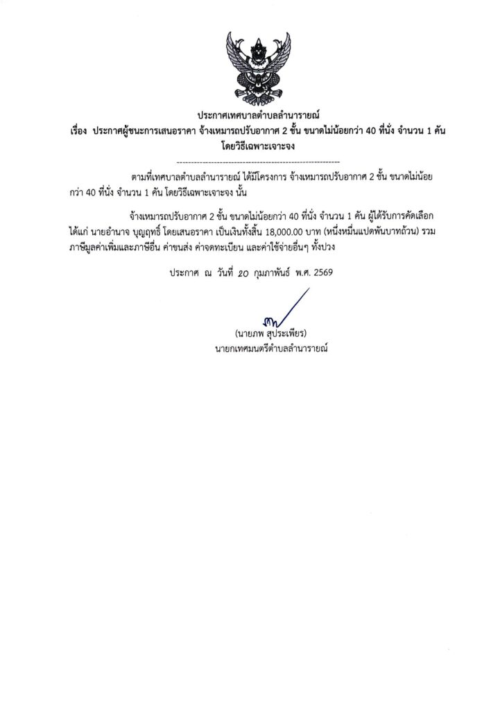 ประกาศผู้ชนะการเสนอราคา จ้างเหมารถปรับอากาศ 2 ชั้น ขนาดไม่น้อยกว่า 40 ที่นั่ง จำนวน 1 คัน โดยวิธีเฉพาะเจาะจง ประกาศผู้ชนะการเสนอราคา 20 กุมภาพันธ์ 256923 กุมภาพันธ์ 2026 lamnaraicity@2021 FacebookFacebookXTwitterLINELine