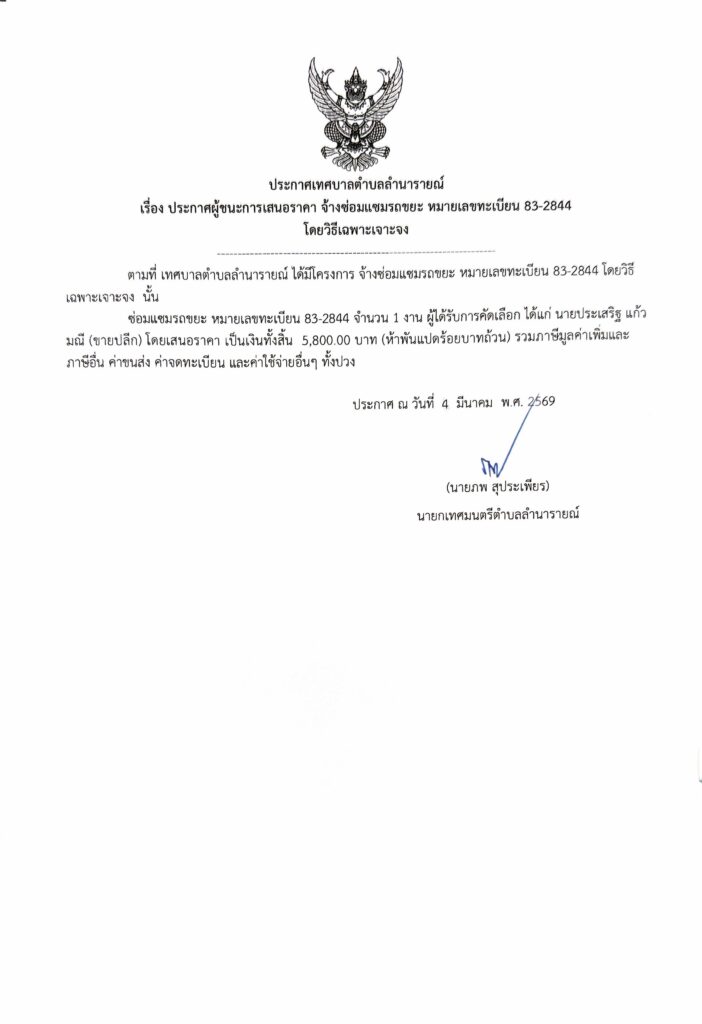ประกาศผู้ชนะการเสนอราคา จ้างซ่อมแซมรถขยะ หมายเลขทะเบียน 83-2844 โดยวิธีเฉพาะเจาะจง ประกาศผู้ชนะการเสนอราคา 4 มีนาคม 25694 มีนาคม 2026 lamnaraicity@2021 FacebookFacebookXTwitterLINELine