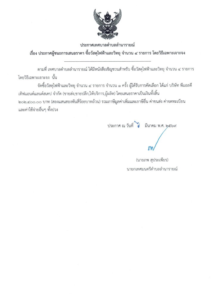 ประกาศผู้ชนะการเสนอราคา ซื้อวัสดุไฟฟ้าและวิทยุ จำนวน 4 รายการ ประกาศผู้ชนะการเสนอราคา 6 มีนาคม 25696 มีนาคม 2026 lamnaraicity@2021 FacebookFacebookXTwitterLINELine