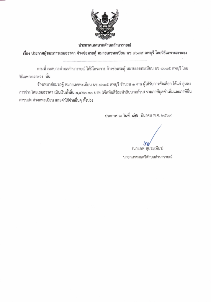 • ประกาศผู้ชนะการเสนอราคา จ้างซ่อมรถตู้ หมายเลขทะเบียน นข 4085 ลพบุรี โดยวิธีเฉพาะเจาะจง