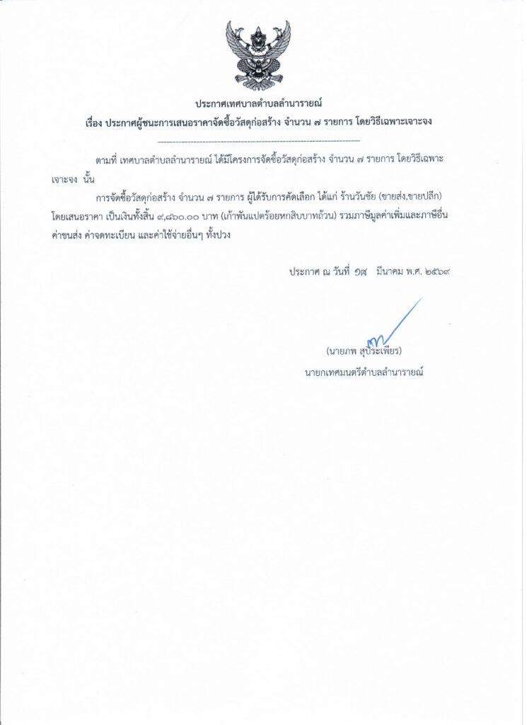 ประกาศผู้ชนะการเสนอราคาจัดซื้อวัสดุก่อสร้าง จำนวน 7 รายการ โดยวิธีเฉพาะเจาะจง ประกาศผู้ชนะการเสนอราคา 18 มีนาคม 256918 มีนาคม 2026 lamnaraicity@2021 FacebookFacebookXTwitterLINELine