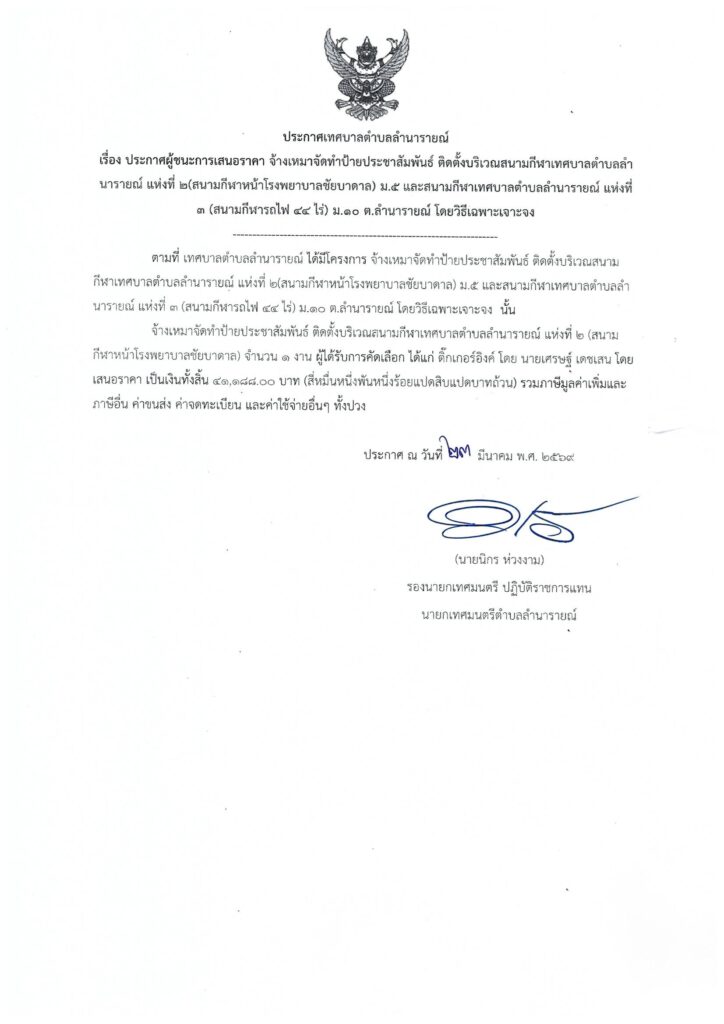 ประกาศผู้ชนะการเสนอราคา จ้างเหมาจัดทำป้ายประชาสัมพันธ์ ติดตั้งบริเวณสนามกีฬาเทศบาลตำบลลำนารายณ์ แห่งที่ ๒ (สนามกีฬาหน้าโรงพยาบาลชัยบาดาล) ม.๕ และสนามกีฬาเทศบาลตำบลลำนารายณ์ ๓ (สนามกีฬารถไฟ ๔๔ ไร่) ม.๑๐ ต.ลำนารายณ์ โดยวิธีเฉพาะเจาะจง