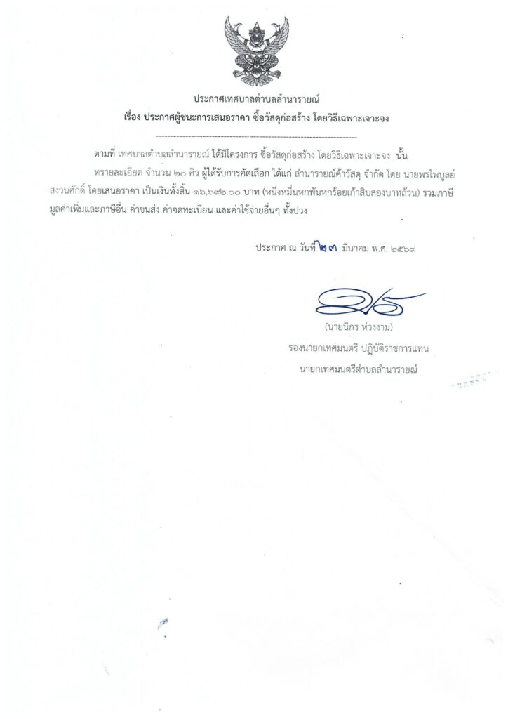 ประกาศผู้ชนะการเสนอราคา ซื้อวัสดุก่อสร้าง โดยวิธีเฉพาะเจาะจง ประกาศผู้ชนะการเสนอราคา 23 มีนาคม 256930 มีนาคม 2026 lamnaraicity@2021 FacebookFacebookXTwitterLINELine